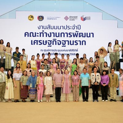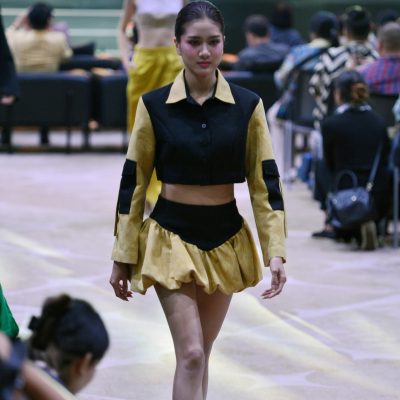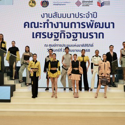 ภายในงานนี้ คณาจารย์และนักศึกษาคณะอุตสาหกรรมสิ่งทอและออกแบบแฟชั่น มหาวิทยาลัยเทคโนโลยี ราชมงคลพระนคร ได้ร่วมนำเสนอแนวคิดในการพัฒนาผลิตภัณฑ์ผ้าทอชุมชนบ้านหนองลิง จังหวัดสุพรรณบุรี ผ่านการใช้เส้นใยใบอ้อย ซึ่งเป็นวัสดุเหลือทิ้งจากภาคการเกษตร มาต่อยอดเป็นเส้นใยสิ่งทอ สื่อถึงการให้คุณค่าใหม่ (Upcycling) และการสร้างสมดุลระหว่างแฟชั่นกับสิ่งแวดล้อม ที่สำคัญผลงานดังกล่าวยังถ่ายทอดการเดินทางของเส้นใยใบอ้อยจากวัสดุเหลือทิ้ง สู่ผืนผ้าที่สามารถสวมใส่ได้จริง เชื่อมโยงธรรมชาติ – ภูมิปัญญา – ความร่วมสมัย อันเป็นภาพสะท้อนของการพัฒนาแฟชั่นไทยสู่ความยั่งยืน พร้อมสร้างแรงบันดาลใจในการต่อยอดภูมิปัญญาท้องถิ่นสู่เวทีระดับสากล