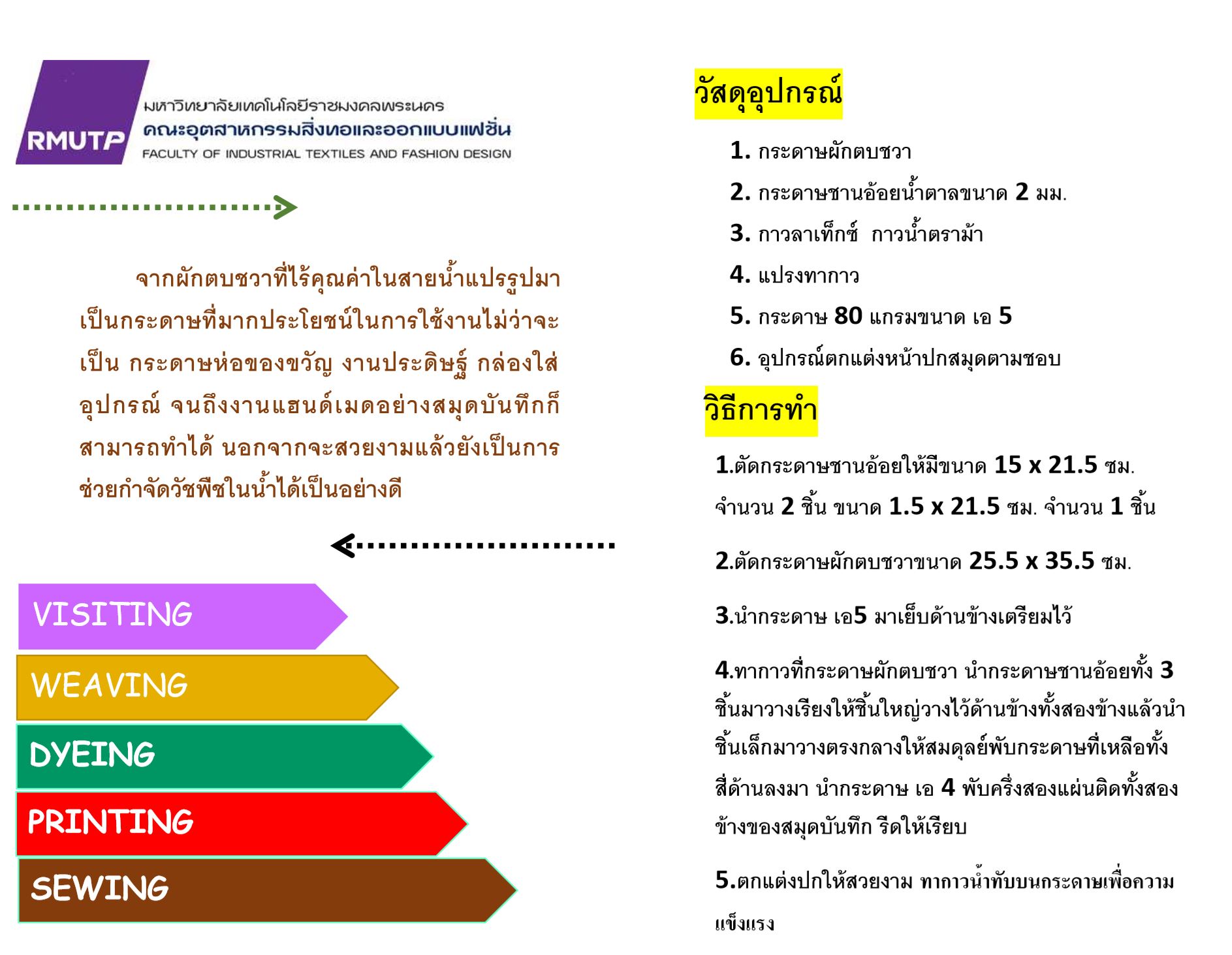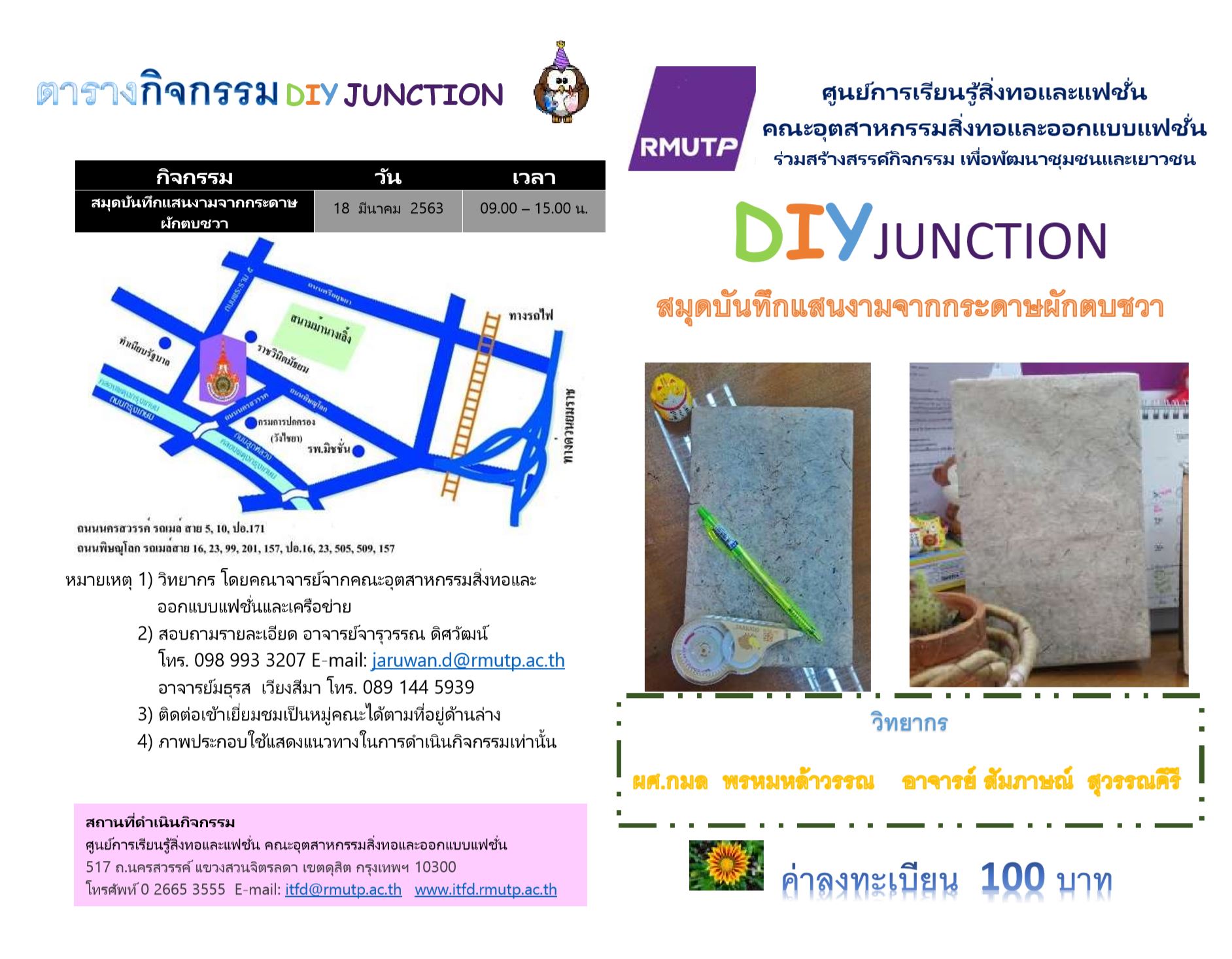 ขอเชิญผู้สนใจ เข้าร่วมอบรม DIY Junction "สมุดบันทึกแสนงามจากกระดาษผักตบชวา" โดยการนำผักตบชวามาแปรรูปเป็นกระดาษห่อของขวัญ งานประดิษฐ์ กล่องใส่อุปกรณ์ และสมุดบันทึก ในวันที่ 18 มีนาคม 2563 ตั้งแต่เวลา 9.00-15.00 น. ณ ศูนย์การเรียนรู้สิ่งทอและแฟชั่น
