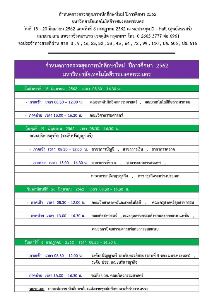 กำหนดการตรวจสุขภาพนักศึกษาใหม่ 2562