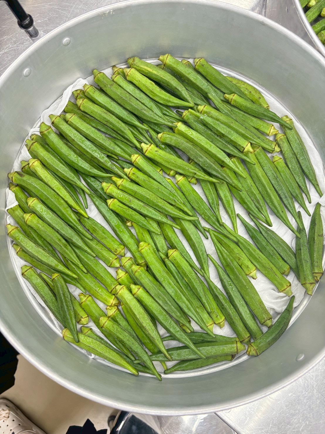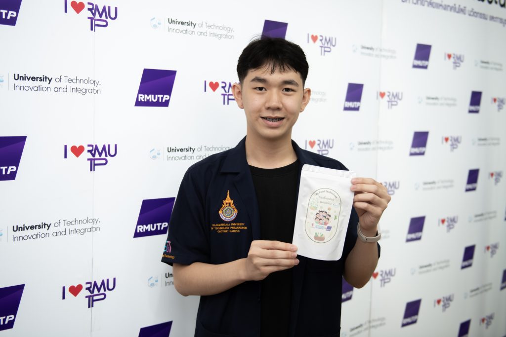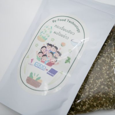 วุฒิ หรือ นายชาญวุฒิ อิทธิชาตินันท์ นักศึกษาชั้นปีที่ 2 สาขาวิชาเทคโนโลยีอาหาร และตัวแทนกลุ่ม เล่าว่า กระเจี๊ยบเขียวผงโรยข้าว มุ่งเน้นการแก้ไขเนื้อสัมผัสของกระเจี๊ยบเขียวสด ซึ่งมีลักษณะเป็นเมือก (มิวซิเลจ-Mucilage) เป็นปัจจัยหนึ่งที่ผู้บริโภคเลือกไม่รับประทาน แต่เมือกเป็นสารประเภทใยอาหารที่ละลายน้ำได้ สารนี้มีลักษณะเหนียวข้น มีสารพอลิแซ็กคาไรด์และโปรตีนเป็นหลัก นอกจากนี้ยังช่วยในการเคลื่อนไหวของลำไส้และเคลือบกระเพาะอาหาร จึงทำให้เกิดแนวคิดการทำผลิตภัณฑ์แปรรูปที่ง่ายต่อการบริโภค แต่คงอุดมด้วยประโยชน์และสารอาหารอย่างครบถ้วน โดยผลิตภัณฑ์ดังกล่าวได้รับแรงบันดาลใจจากการศึกษาดูงานโครงการตามรอยพระราชดำริเพื่ออนุรักษ์และผลิตภัณฑ์เพื่อใช้ประโยชน์จากพันธุกรรมพืช