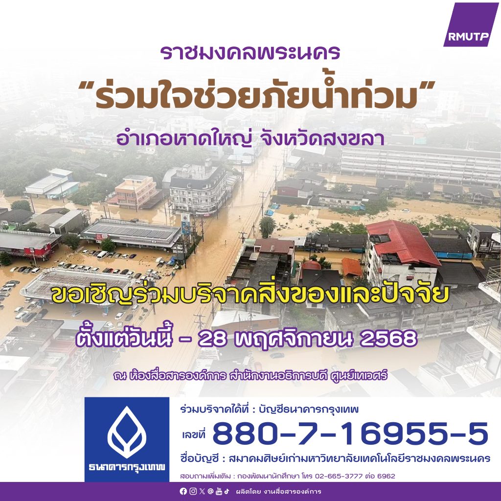 จากสถานการณ์น้ำท่วมรุนแรงในพื้นที่ อ.หาดใหญ่ จ.สงขลา และหลายจังหวัดในภาคใต้ ส่งผลกระทบต่อประชาชนในพื้นที่เป็นวงกว้าง มหาวิทยาลัยเทคโนโลยีราชมงคลพระนคร (ราชมงคลพระนคร) และสมาคมศิษย์เก่ามหาวิทยาลัยเทคโนโลยีราชมงคลพระนคร ร่วมเปิดพื้นที่มหาวิทยาลัยรับสิ่งของบริจาค อาทิ ข้าวสาร อาหารแห้ง บะหมี่กึ่งสำเร็จรูป ปลากระป๋อง อาหารกระป๋อง ผ้าอนามัย สบู่ ยาสีฟัน และสิ่งของอุปโภคบริโภค ณ ห้องสื่อสารองค์การ สำนักงานอธิการบดี ราชมงคลพระนคร (ศูนย์เทเวศร์) หรือบริจาคเงิน ผ่านบัญชีชื่อ สมาคมศิษย์เก่ามหาวิทยาลัยเทคโนโลยีราชมงคลพระนคร เลขที่ 880-7-16955-5 ธนาคารกรุงเทพ ตั้งแต่วันนี้ – 28 พฤศจิกายน 2568 โดยจะรวบรวมสิ่งของนำไปช่วยเหลือและมอบให้กับชาวบ้านผู้ประสบกับอุทกภัยในพื้นที่ จ.สงขลา เพื่อร่วมบรรเทาความเดือดร้อนอย่างเร่งด่วน สอบถามเพิ่มเติมที่ กองพัฒนานักศึกษา โทร 02-665-3777 ต่อ 6962