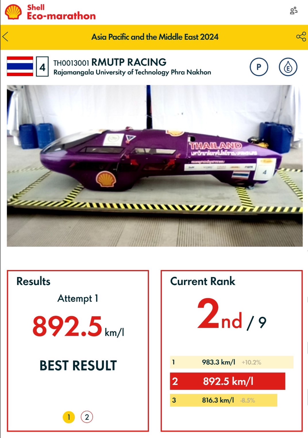 ขอแสดงความยินดี ทีม RMUTP RACING นักศึกษาคณะครุศาสตร์อุตสาหกรรม มหาวิทยาลัยเทคโนโลยีราชมงคลพระนคร ประกอบด้วย นายเตชฤทธิ์ โยธินรัตนกุล (คนขับ) นายพรพิพัฒน์ ศรีทวีกาศ (ผู้จัดการทีม) นายนพพร คงเนียม (ช่าง 1) นายสิริวุฒิ เจริญลาภ (ช่าง 2) คว้าลำดับที่ 2 ระดับเอเชียแปซิฟิก และตะวันออกกลาง ในการแข่งขัน Shell eco-marathon Asia Pacific and the Middle East 2024 ประเภทเครื่องยนต์สันดาปภายใน prototype (ICE) โดยใช้เชื้อเพลิงเอทานอล ในการแข่งขัน โดยมี ว่าที่ ร.ท. ณัฏฐกิตติ์ ฤทธิ์ทอง อาจารย์สาขาเครื่องกล และ ร.ต.อ.วุฒิชัย เหมาะใจ เป็นที่ปรึกษาการแข่งขัน ด้วยสถิติ 892 km/l ไต่อันดับ 4 จากปี 2023 โดยปีนี้มีทีมเข้าร่วมแข่งขัน จำนวน 80 ทีม 12 ประเทศ จากเอเชีย และตะวันออกกลางเข้าร่วมการแข่งขัน ณ สนามแข่งรถ Pertamina Mandalika International Street Circuit เกาะลอมบอก ประเทศอินโดนีเซีย ระหว่างวันที่ 2-6 กรกฎาคม 2567