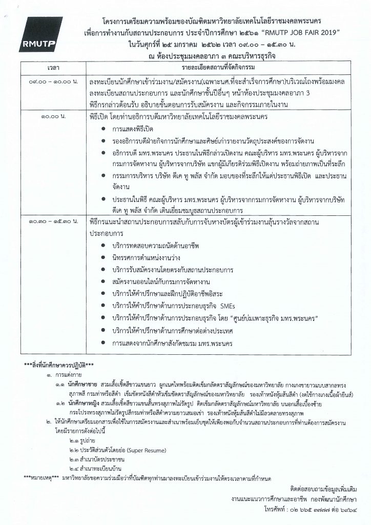 ขอเชิญร่วมงาน RMUTP Job Fair 2019 พบกับบริษัทชั้นนำกว่า 80 บริษัท ที่จะมาให้บริการนักศึกษา พร้อมแนะนำการเตรียมความพร้อมในการสมัครงาน รวมทั้งแนวทางในการประกอบอาชีพ พร้อมด้วยกิจกรรมบนเวทีจากชมรมต่างๆ และยังมีของรางวัลอีกมากมาย ในวันที่ 25 มกราคม 2562 ณ ห้องประชุมมงคลอาภา ชั้น 3 คณะบริหารธุรกิจ ศูนย์พณิชยการพระนคร มหาวิทยาลัยเทคโนโลยีราชมงคลพระนคร