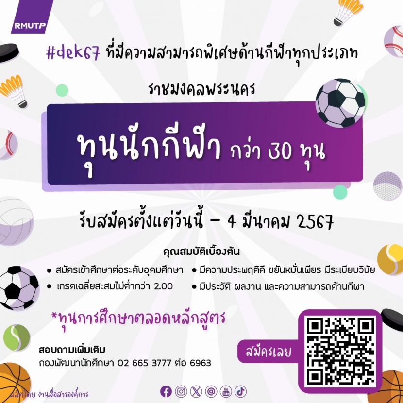 มหาวิทยาลัยเทคโนโลยีราชมงคลพระนคร เปิดรับสมัครและคัดเลือกนักศึกษาที่มีความสามารถทางกีฬาเด่น เข้าศึกษาต่อในระดับอุดมศึกษา ประเภททุนการศึกษาสำหรับนักศึกษาที่มีความสามารถพิเศษด้านกีฬา ประจำปีการศึกษา […]