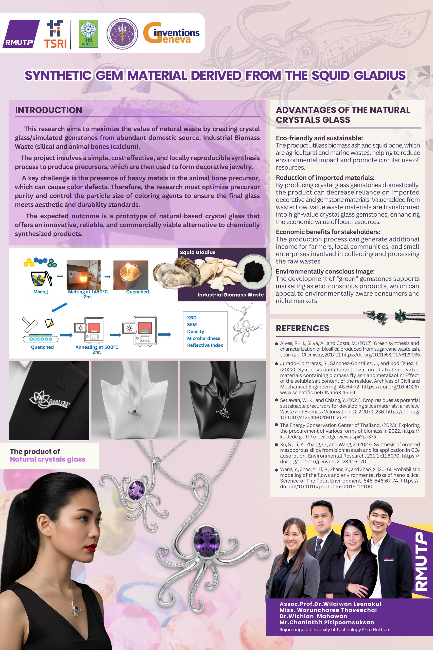 The 51st International Exhibition of Inventions Geneva ถือเป็นเวทีที่เก่าแก่และใหญ่ที่สุดในทวีปยุโรป และเป็นเวทีที่ได้รับความสนใจจากนักประดิษฐ์ นักวิจัย นักลงทุน และนักวิชาการจากทั่วโลก ซึ่งจัดขึ้นโดย PALEXPO SA ร่วมกับ International Federation of Inventors' Associations (IFIA) สหพันธ์สมาคมนักประดิษฐ์นานาชาติ ภายใต้การสนับสนุนของเมืองเจนีวา รัฐบาลสวิส และองค์การทรัพย์สินทางปัญญาโลก หรือ World Intellectual Property Organization (WIPO) โดยในปีนี้ผลงานเรื่อง แก้วจากขี้เถ้าชีวมวลและโครงร่างแข็งของสัตว์ทะเลประเภทหมึกและหอย ทีมผู้วิจัยประกอบด้วย รศ.ดร.วิไลวรรณ ลีนะกุล คณะวิทยาศาสตร์และเทคโนโลยี อาจารย์ชลธิศ ปิติภูมิสุขสันต์ คณะครุศาสตร์อุตสาหกรรม อาจารย์วรัญชลีย์ ทวีชัย คณะวิศวกรรมศาสตร์ ดร.วิเชียร มหาวัน คณะวิศวกรรมศาสตร์ ราชมงคลพระนคร เป็น 1 ใน 130 ผลงานที่ได้รับคัดเลือกจากสำนักงานการวิจัยแห่งชาติ (วช.) ให้เป็นตัวแทนประเทศไทยเข้าร่วมประกวดและจัดแสดงผลงาน ซึ่งในเวทีดังกล่าวมีผลงานประดิษฐ์คิดค้นจากทั้งภาครัฐและภาคเอกชน มหาวิทยาลัย สถาบันต่างๆ นักวิจัยและนักประดิษฐ์อิสระจากต่างประเทศ เข้าร่วมประกวดและจัดแสดง จำนวนกว่า 1,000 ผลงาน รวมกว่า 30 ประเทศ